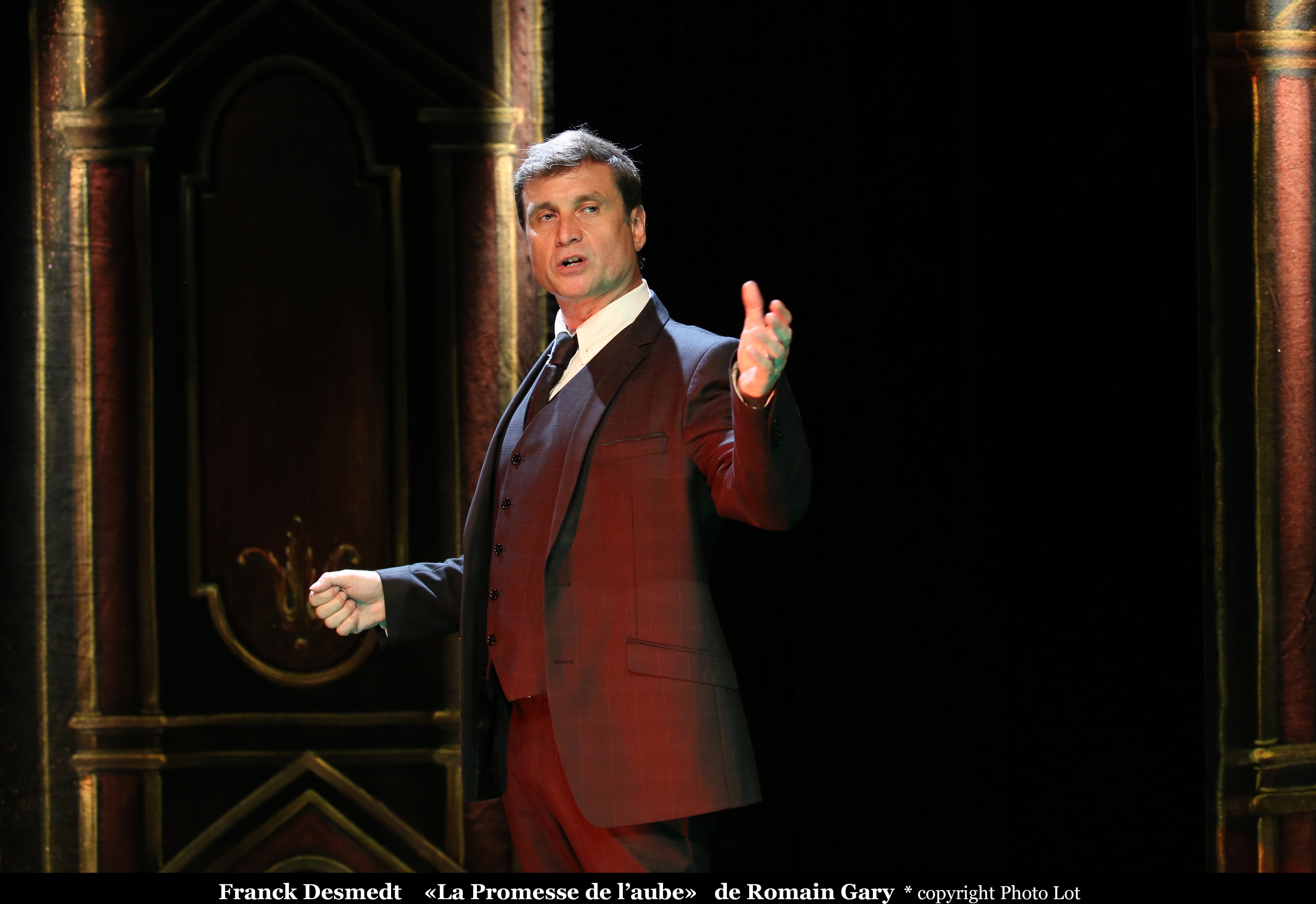 Sur scène, Franck Desmedt est tour à tour le jeune Gary, sa mère, mais aussi le général De Gaulle, la femme de ménage espiègle ou le roi de Suède. Il raconte avec virtuosité l’histoire pleine d’humour et de tendresse de celui qui voulut être conforme aux rêves de grandeur que sa mère avait pour lui et qui fit de son existence une sorte de chef-d’œuvre.