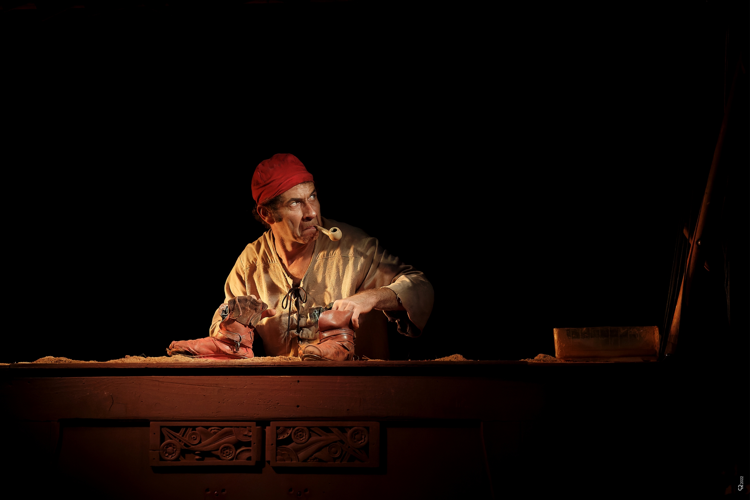 Sur un comptoir d’auberge d’où surgissent comme par magie coffre, bateau, île ou palmier, les personnages sont représentés par leurs chaussures et bottes, à hauteur du regard d’enfant de Jim. Le récit est accompagné au violoncelle par Pierre Burette, qui compose une véritable narration musicale, avec ambiances et bruitages.