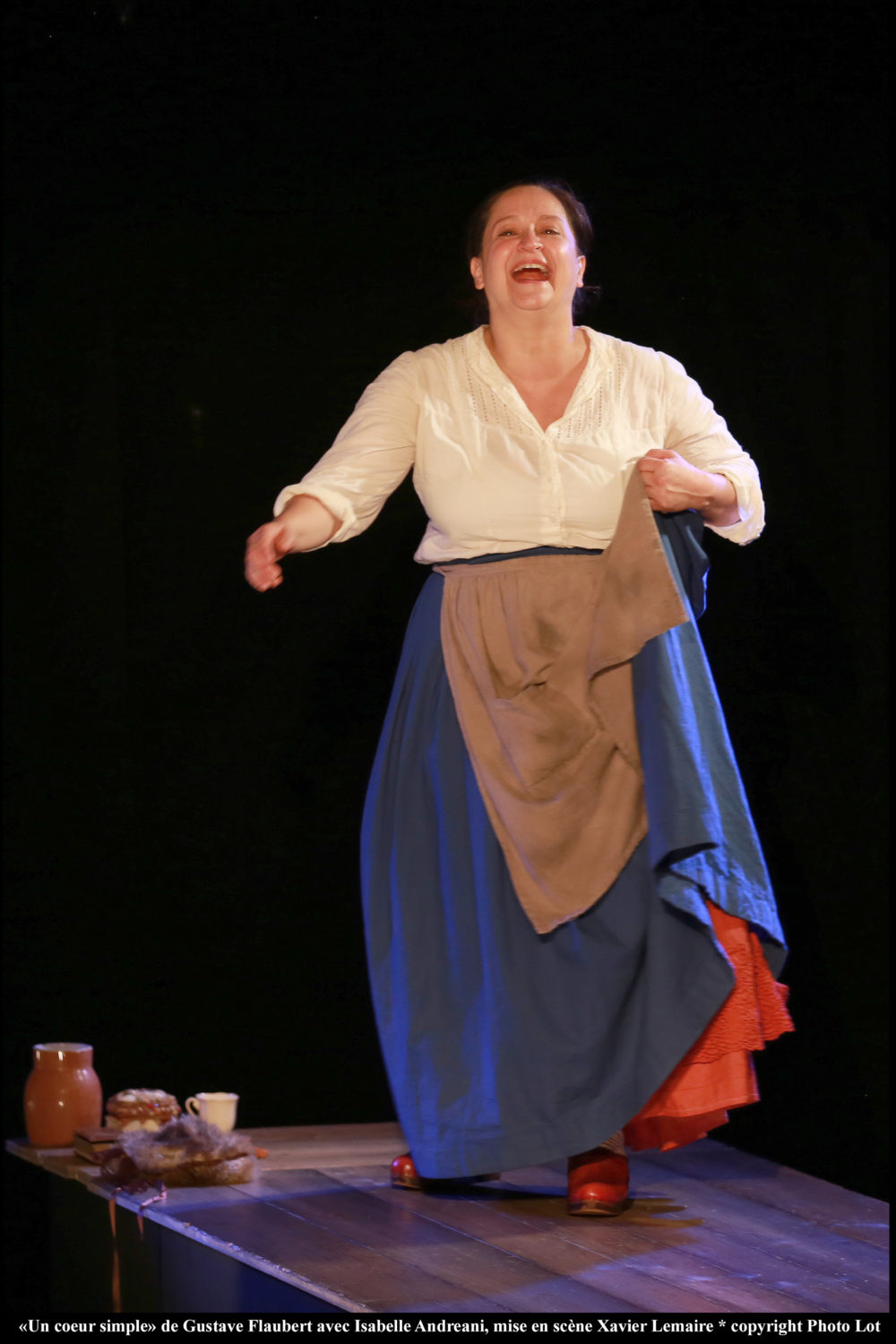 Un cœur simple retrace la vie de Félicité, servante à Pont-l’Évêque au XIXe siècle. Une vie de service dépeinte par Flaubert dans une langue respectée et magnifiée par Isabelle Andréani. Celle-ci se saisit de cette histoire d’une domestique ordinaire, humble, honnête, travailleuse, aimante, et en fait un bijou de lumière et de pureté. Elle l’incarne avec toute la force émotionnelle et la générosité qu’on lui connaît, accompagnée par la mise en scène fluide et charnelle de Xavier Lemaire.
